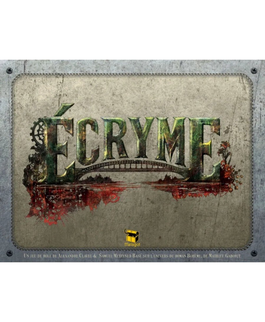 ÉCRYME est un jeu de rôle steampunk dystopique où le monde a été submergé par un liquide corrosif appelé l’écryme. Pour survivre, les humains se sont retranchés dans des cités industrielles reliées entre elles par les traverses, de gigantesques ponts de pierre et de métal où rôdent parias et bandits sous la coupe des seigneurs de l’ancien temps.