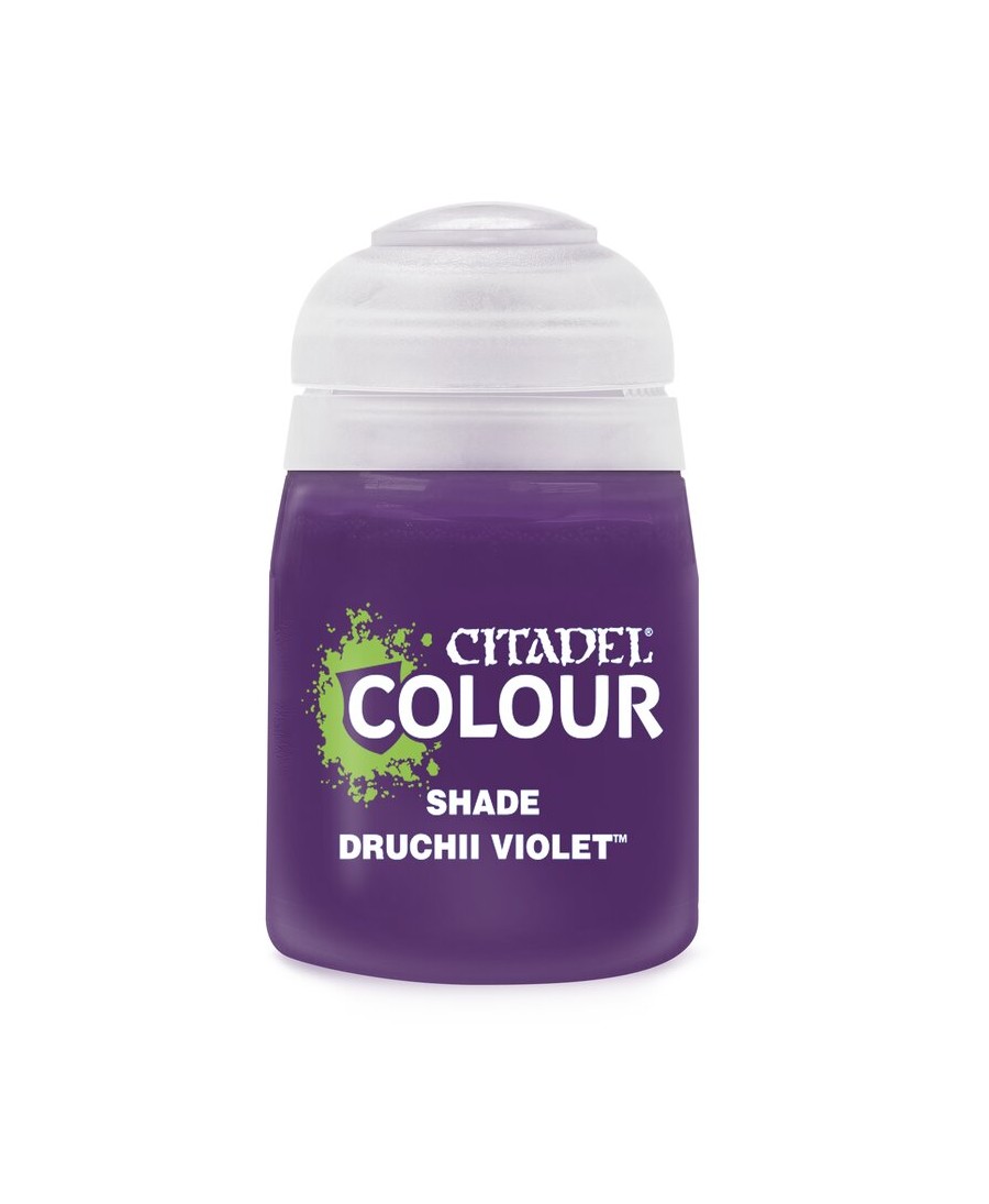 Expédition rapide après avoir passé commande !Peinture Citadel : Shade - Druchii Violet, d'aspect naturel conçue pour rehausser les détails. Finition mate lisse À l'eau Taille de pot : 18ml, Produit officel Games Workshop