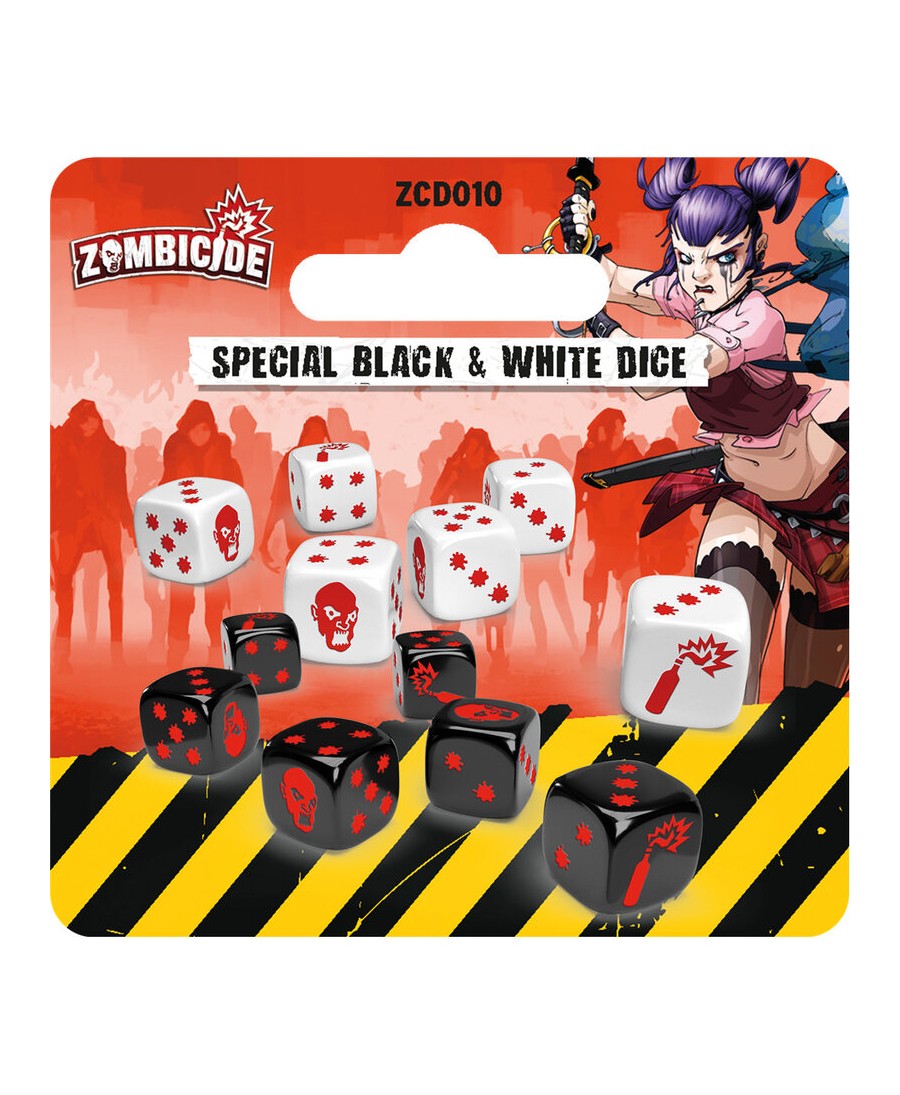 Dés spéciaux pour le jeu Zombicide, contenant 6 dès Zombicide noirs et 6 dés Zombicide blanc. Le 6 est remplacé par un cocktail molotov et le 1 par une tête de zombie.