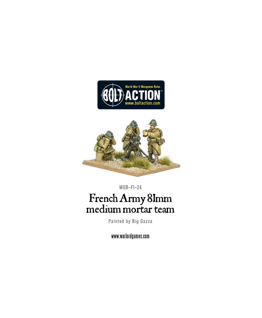 Cette boite contient l'ensemble des composants nécessaires à l'assemblage d'une figurine de Mortier Medium 81mm ainsi que de trois figurines de soldats qui en forment l'équipage pour vos parties de Bolt Action, le jeu de figurines, sous les couleurs de l'Armée Française. Ces figurines sont à l'échelle 28mm. Des socles sont également inclus.
