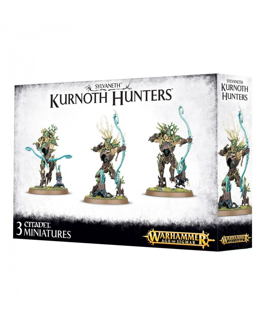 Ce kit plastique contient toutes les pièces nécessaires pour assembler trois Kurnoth Hunters, armés au choix de longues épées, de faux et de grands arcs. Une des figurines peut être assemblée en tant que huntmaster, avec un cimier et une arme spéciale, et le kit comprend sept fiels-follets supplémentaires. Kit fourni avec trois socles ronds Citadel de 50mm.