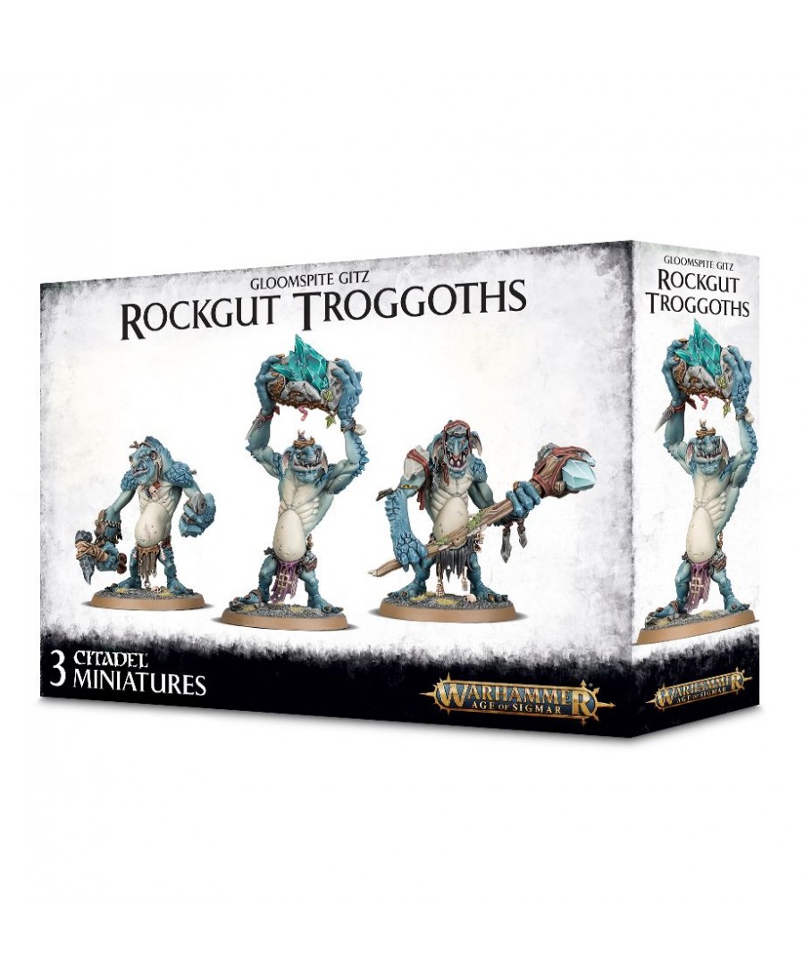 Cette boite contient l'ensemble des composants nécessaires à l'assemblage de trois figurines de Rockgut Troggoths de la faction Gloomspite Gitz pour le jeu de figurines Warhammer Age Of Sigmar. Ces figurines sont en plastique et à l'échelle 28mm. Des socles Citadel sont également inclus.