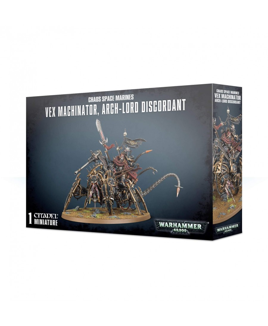 Cette boite contient l'ensemble des composants nécessaires à l'assemblage d'un Vex Machinator, Arch-Lord Discordant des Space Marines du Chaos pour vos parties de Warhammer 40 000, le jeu de figurines. Cette figurine est en plastique dur et à l'échelle 28mm. Un socle ovale Citadel de 120mm par 92 est également inclus.