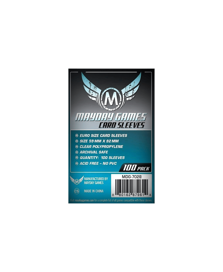 Expédition rapide après avoir passé commande !Ce paquet contient 100 protège cartes de qualité standard de la marque Mayday Games. Le format de ces protège cartes est Européen (59x92mm).