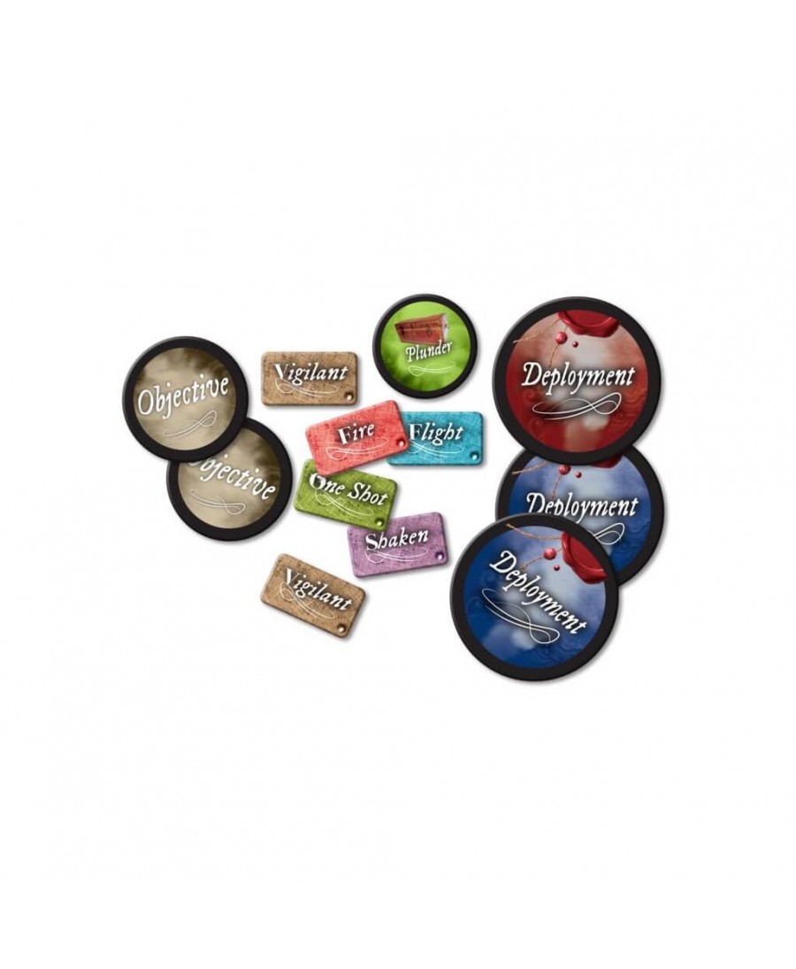 Cette planche de pions contient tous les marqueurs nécessaires à une partie de Mousquets & Tomahawks, quelque soit la période jouée. Simplifiez et clarifiez vos parties avec ces petits jetons et préoccupez-vous uniquement de votre stratégie !